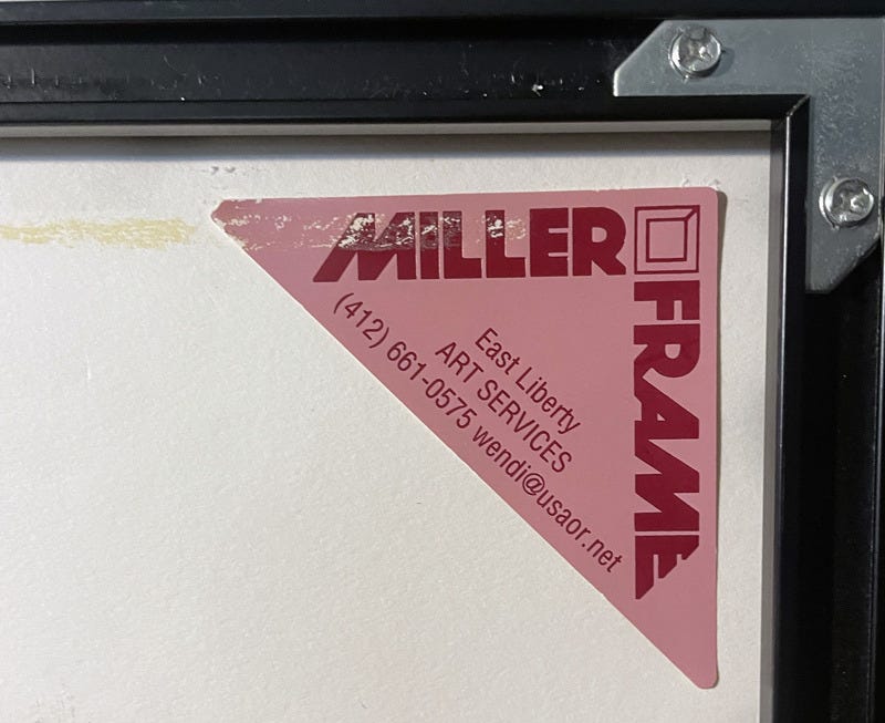 The other sticker on the back reminded me of who framed the art. Miller Frame’s owner, Wendi Miller, was accomplished in her craft and was an important part of the community. She configured her shop to have a dedicated space for her large and friendly dog to hang out with her. Customers could see him, but he didn’t have access to the open area, in case anyone was afraid of large dogs.
