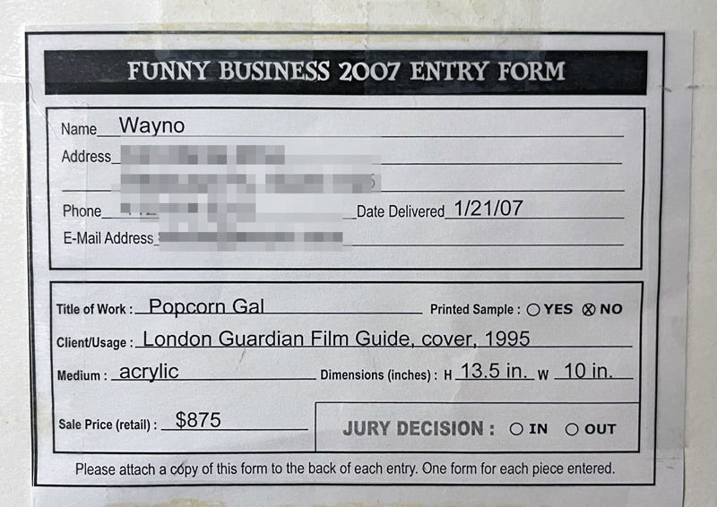 This entry form for a 2007 group art show was attached to the backing. I had a few pieces in the show, but “Popcorn Gal” didn’t make the cut. By the way, that was an aspirational price on the art. I sold it for MUCH less than that.